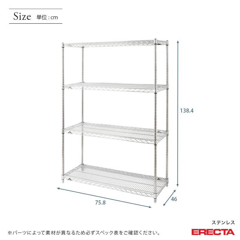 商品仕様 商品シリーズ ステンレスエレクター PSポールタイプ ダイカスト・アジャストボルト付き 4段 外形寸法 幅75.8x奥行46.0x高さ138.4cm シェルフ内寸(約) 幅68.3x奥行38.5cm ポール長さ 138.4cm 備考 棚板1枚につき、テーパー4組が付属します。